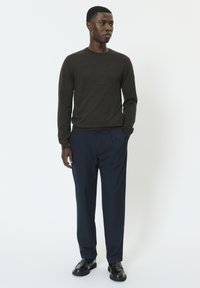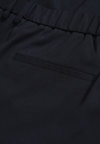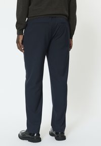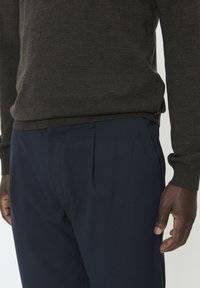 Pantaloni blu navy con vestibilità comoda, caratterizzati da pieghe davanti, tasche laterali e tessuto liscio, abbinati a scarpe nere e a un maglione scuro.