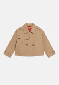 Giovane ragazza con due chignon che indossa un cappotto corto blu navy, gonna plissettata, calze bianche al ginocchio e mocassini neri, in piedi davanti a uno sfondo bianco.