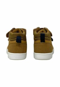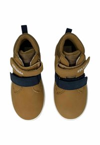 Scarpe alte per bambini color sabbia con un collo in tessuto testurizzato, suola in gomma bianca e una fascia nera regolabile con logo.