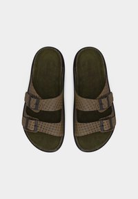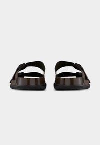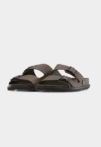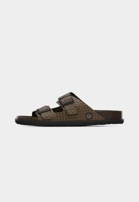 Sandalo slide marrone con texture, due cinturini con fibbia e suola nera, visto da un'angolazione sopra un pavimento beige con moquette e uno sfondo neutro.