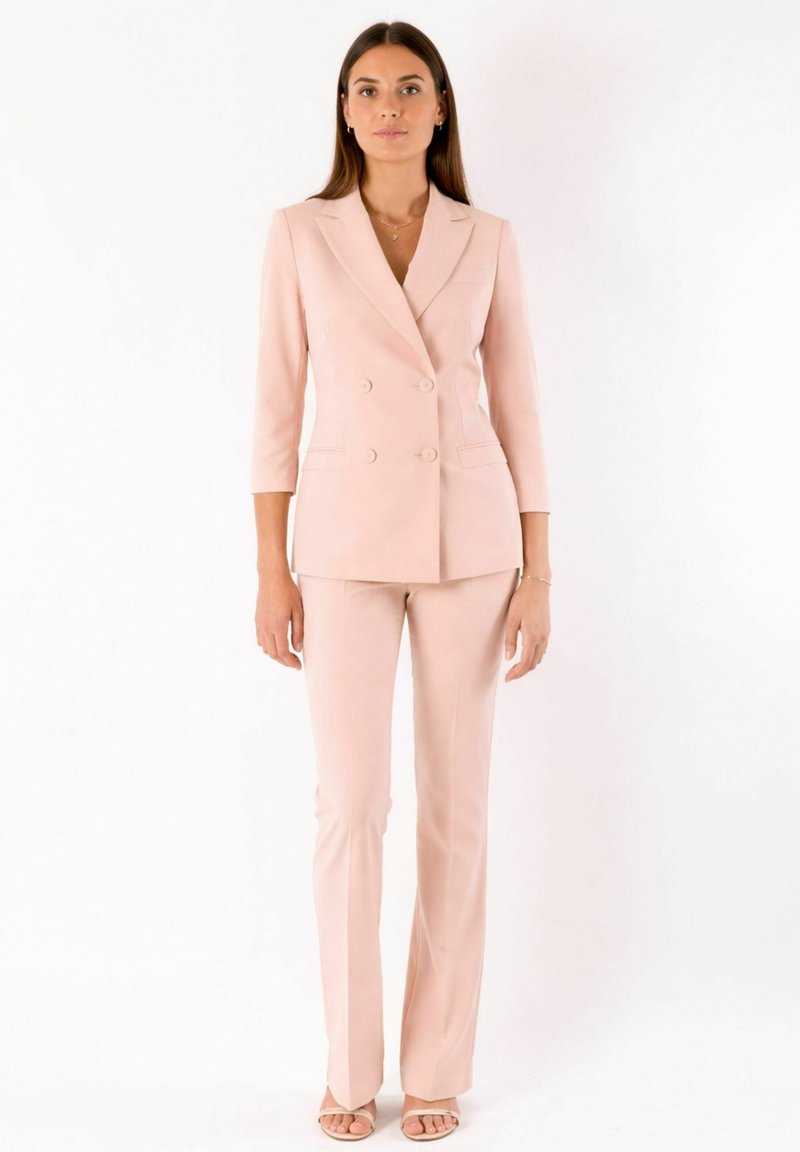 Donna che indossa un blazer doppiopetto color rosa chiaro con maniche a tre quarti e pantaloni a gamba dritta abbinati, in piedi con espressione neutra su sfondo bianco.