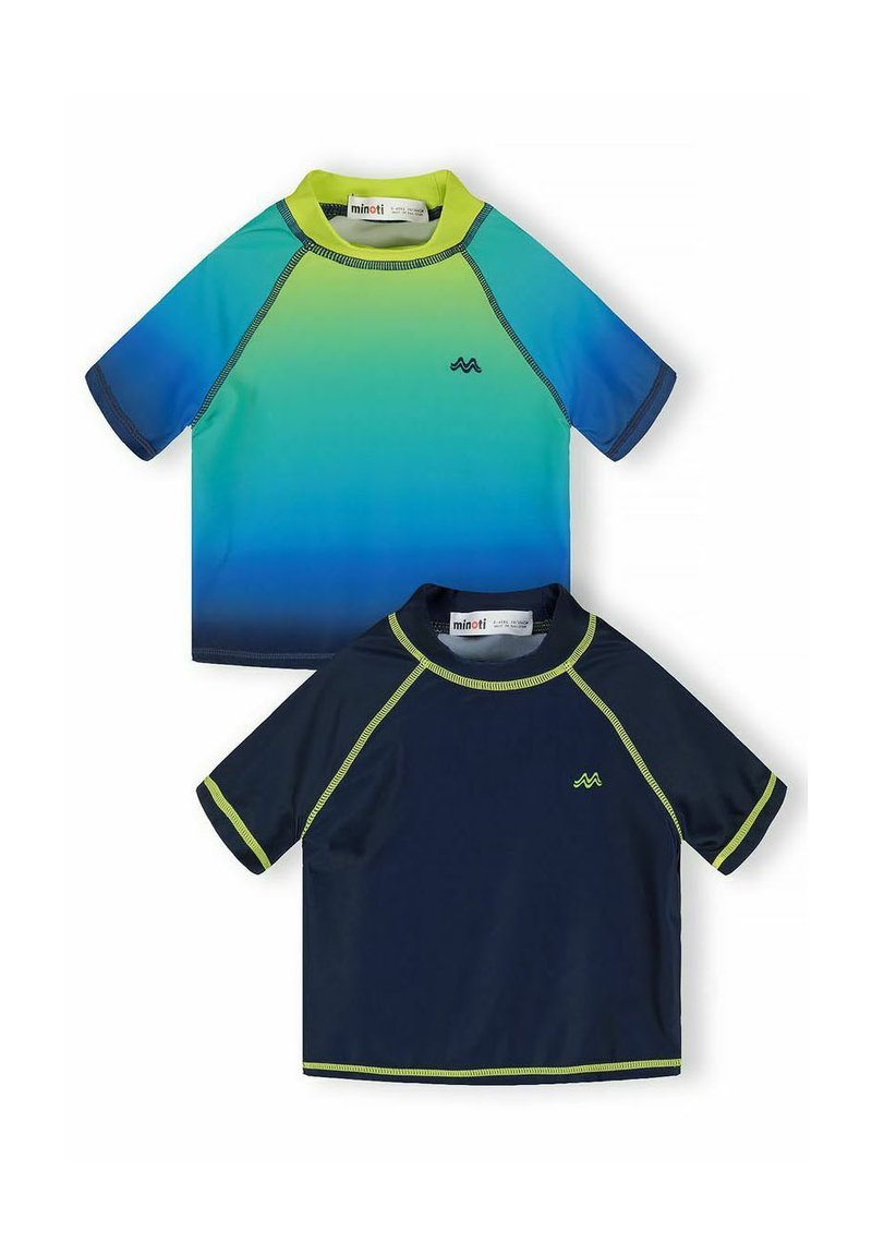 Due magliette da bagno a maniche corte per bambini, una sfumata blu-verde, l'altra blu scuro con rifiniture verde neon, entrambe con un piccolo logo a forma di onda sul petto.