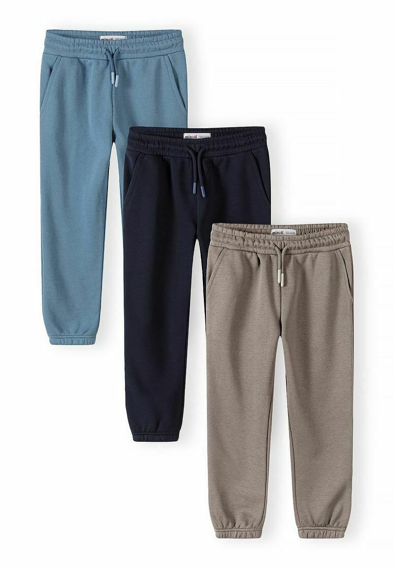 Tre paia di pantaloni jogger per bambini con vita elastica, nei colori blu, blu scuro e taupe, con tasche laterali e polsini alla caviglia, disposti piani su sfondo bianco.