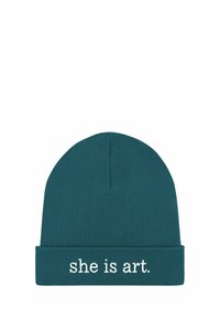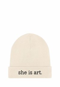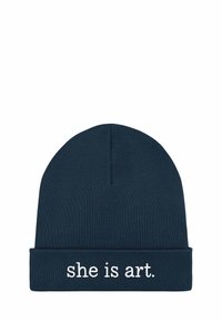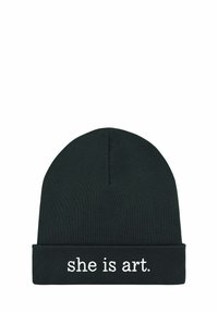 Cappello a cuffia nero in maglia a coste con testo ricamato bianco "she is art", forma sagomata con bordo leggermente piegato. Texture morbida.