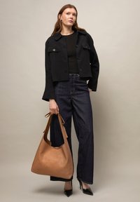 Donna che indossa una giacca corta nera, un top nero, jeans scuri a gamba larga, tacchi neri e tiene una grande borsa in pelle color cuoio.