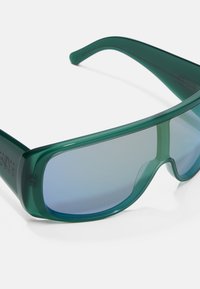 Occhiali da sole verdi con design avvolgente, dotati di lenti specchiate blu e un motivo testurizzato sulle aste. Realizzati in plastica leggera.