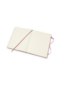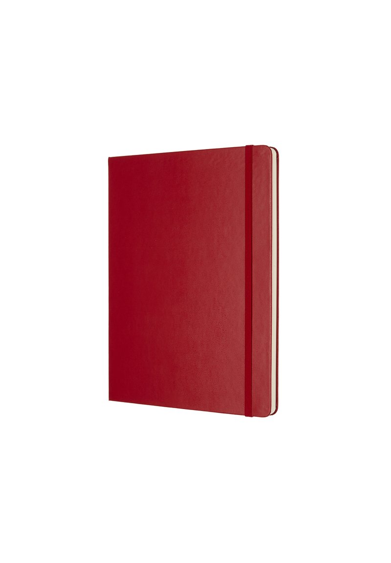 Quaderno rilegato rosso con una texture liscia, chiusura con elastico e angoli arrotondati. Pagine bianche visibili lungo il lato.