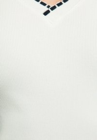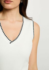 Giovane donna con capelli lunghi e scuri, indossa una canotta bianca senza maniche con rifiniture nere e pantaloni stampati zebrati in bianco e nero, annodati in vita.