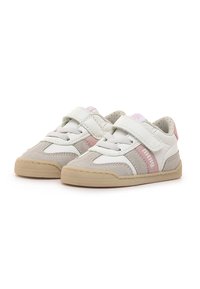 Scarpa da ginnastica per bambini in pelle bianca e camoscio grigio con un accento rosa. Presenta una chiusura a strappo, punta arrotondata e suola in gomma.