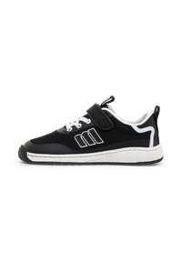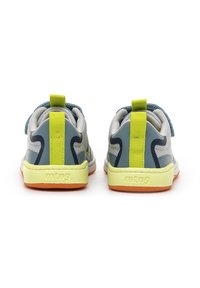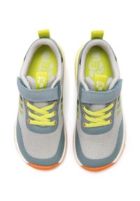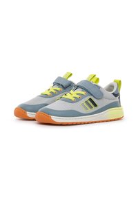 Scarpa da ginnastica in rete grigia con accenti blu, lacci giallo neon e suola in gomma arancione; chiusura a strappo per una calzata sicura.