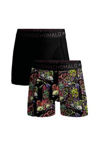 Boxer in tessuto nero con motivi grafici colorati e dettagliati. Vita elasticizzata con logo "MUCHACHO MALO" in viola.