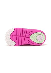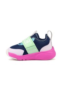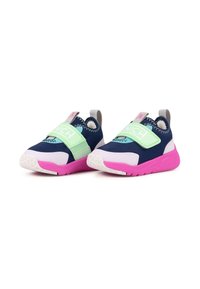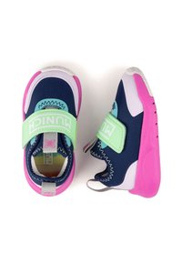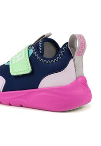 Scarpa da ginnastica per bambini blu navy con suola rosa, cinturino verde, dettagli bianchi e tessuto testurizzato. Presenta un anello per la trazione e cuciture a zigzag.