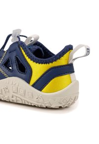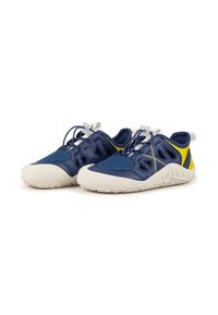 Scarpa per bambini blu navy e gialla con tomaia in mesh testurizzato, design traforato, lacci elastici e suola in gomma bianca con grip a motivo.