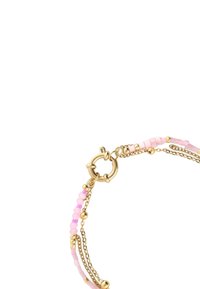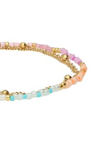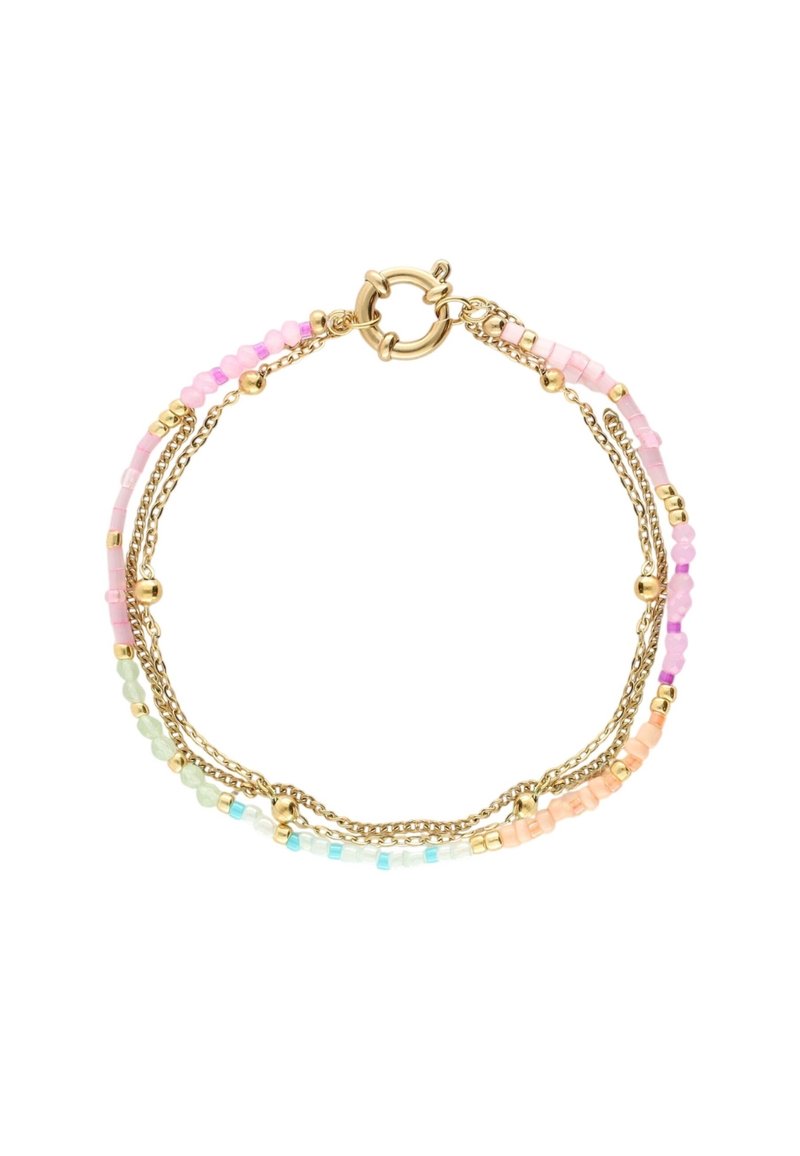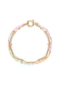 Braccialetto delicato con catene d'oro e perline pastello multicolori, fissato con una chiusura rotonda in oro.