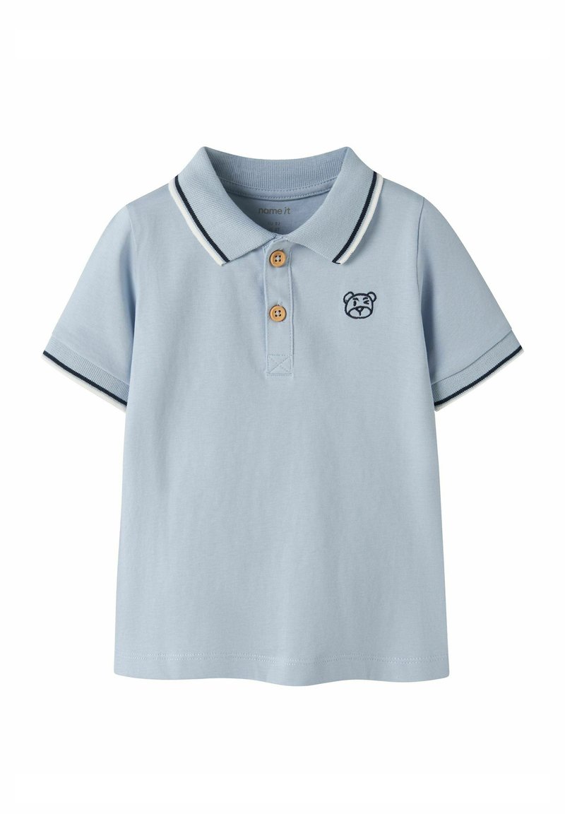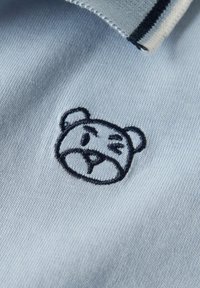 Polo a maniche corte azzurro chiaro con due bottoni marroni, rifiniture blu navy e bianche su colletto e maniche, e un piccolo volto di orso ricamato sul petto.