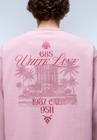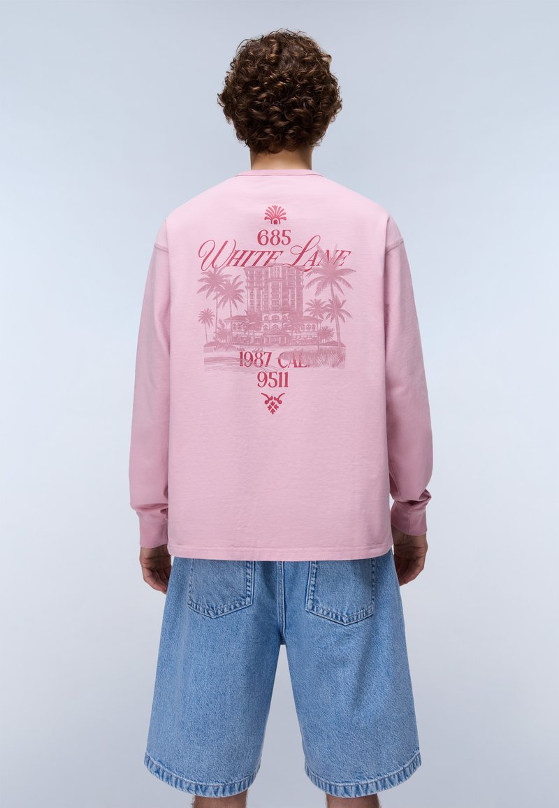 Persona che indossa una maglietta rosa a maniche lunghe con disegno di palme rosse e edificio e la scritta "685 White Lane 1987 CAL 9511", pantaloncini di jeans blu.