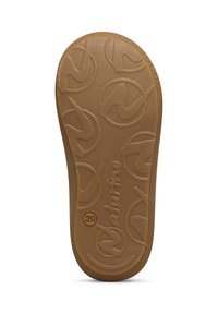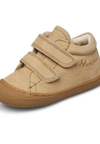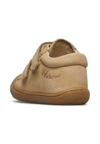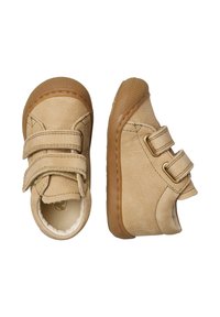 Scarpa in pelle beige con finitura testurizzata, dotata di due cinturini in velcro e una suola in gomma flessibile con punta arrotondata. Logo del marchio visibile.