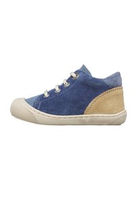 Sneaker per bambini in beige, marrone, arancione e verde, con suola in gomma e lacci grigi chiari, mostrato di lato su sfondo bianco.
