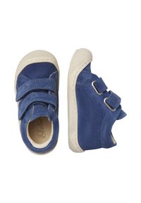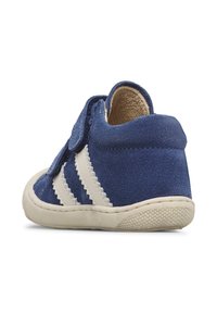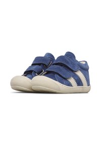 Scarpa da bambino in camoscio blu con due strisce bianche, due cinturini in Velcro e suola e punta in gomma beige, vista laterale su sfondo bianco.