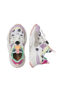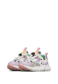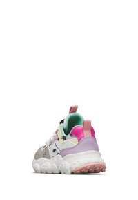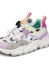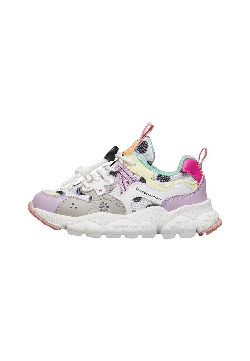 Scarpa da ginnastica per bambini con accenti pastello multicolore, intagli a forma di fiore, lacci elastici con chiusura a cordoncino e suola bianca testurizzata, marchiata "Flower Mountain".