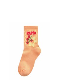 Tre calzini colorati con disegni alimentari: viola con una fetta di pizza, arancione con pasta e pomodori, azzurro con gelato in una coppetta da dessert.