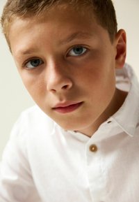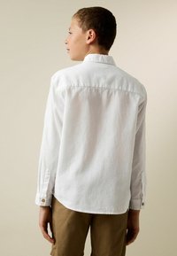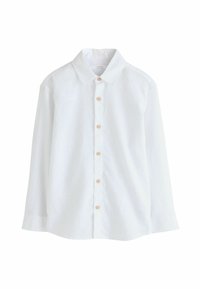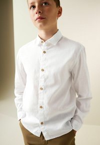 Camicia bianca a maniche lunghe con colletto, presenta una parte anteriore con bottoni e bottoni in legno, realizzata con un tessuto leggero dalla texture liscia.