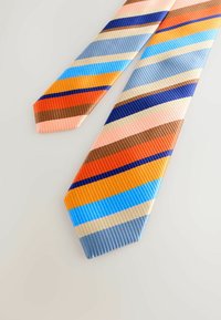 Cravatta di seta con strisce orizzontali arancioni, blu, marroni e beige. Design strutturato con punta appuntita e nodo superiore.