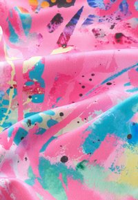 Leggings colorate vivaci con un motivo astratto multicolore in rosa, blu, giallo e verde, realizzate in un tessuto liscio ed elastico.