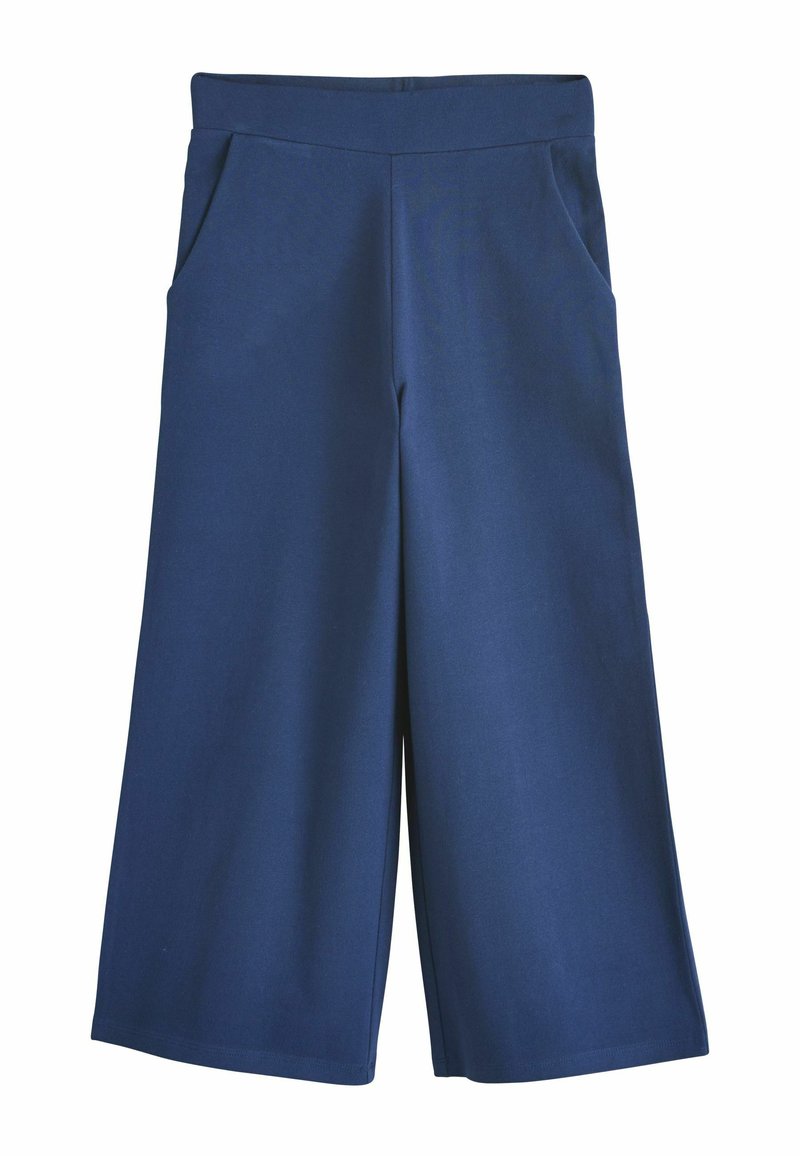Pantaloni cropped a gamba larga blu navy con tasche laterali e vita aderente.