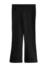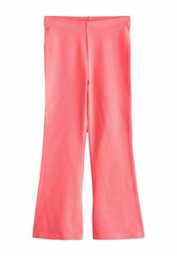 Quattro paia di pantaloni a zampa: motivo floreale rosa, corallo uniforme, rosa chiaro con stampa floreale piccola e nero uniforme. Tessuto liscio, stile aderente.