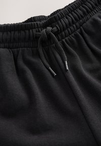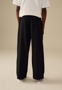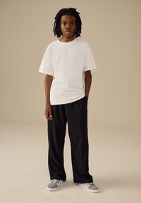 Persona che indossa pantaloni larghi neri, maglietta bianca e sneakers grigie con strisce bianche, in piedi su pavimento beige con sfondo beige.