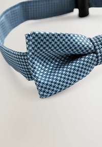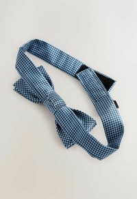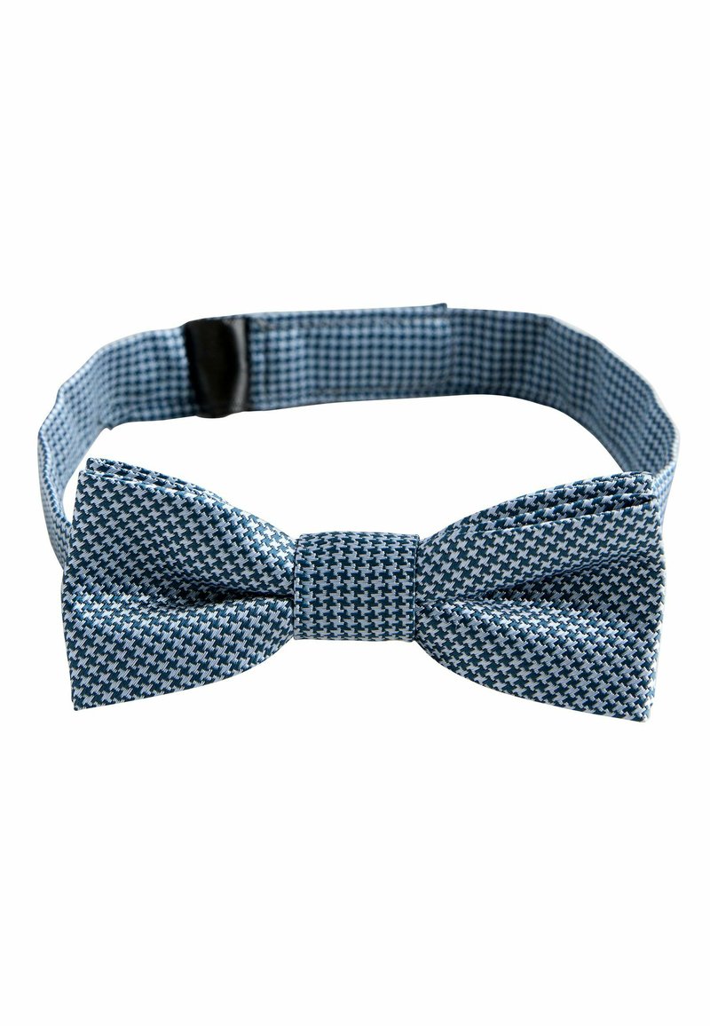 Papillon a quadretti blu e bianchi con tessuto dall'aspetto strutturato. Cinturino regolabile e motivo intrecciato ne aumentano l'appeal visivo.