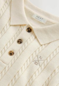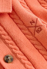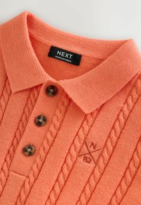 Polo a maniche corte in corallo brillante, caratterizzato da texture a coste, motivo a trecce orizzontali, abbottonatura con tre bottoni e logo ricamato.