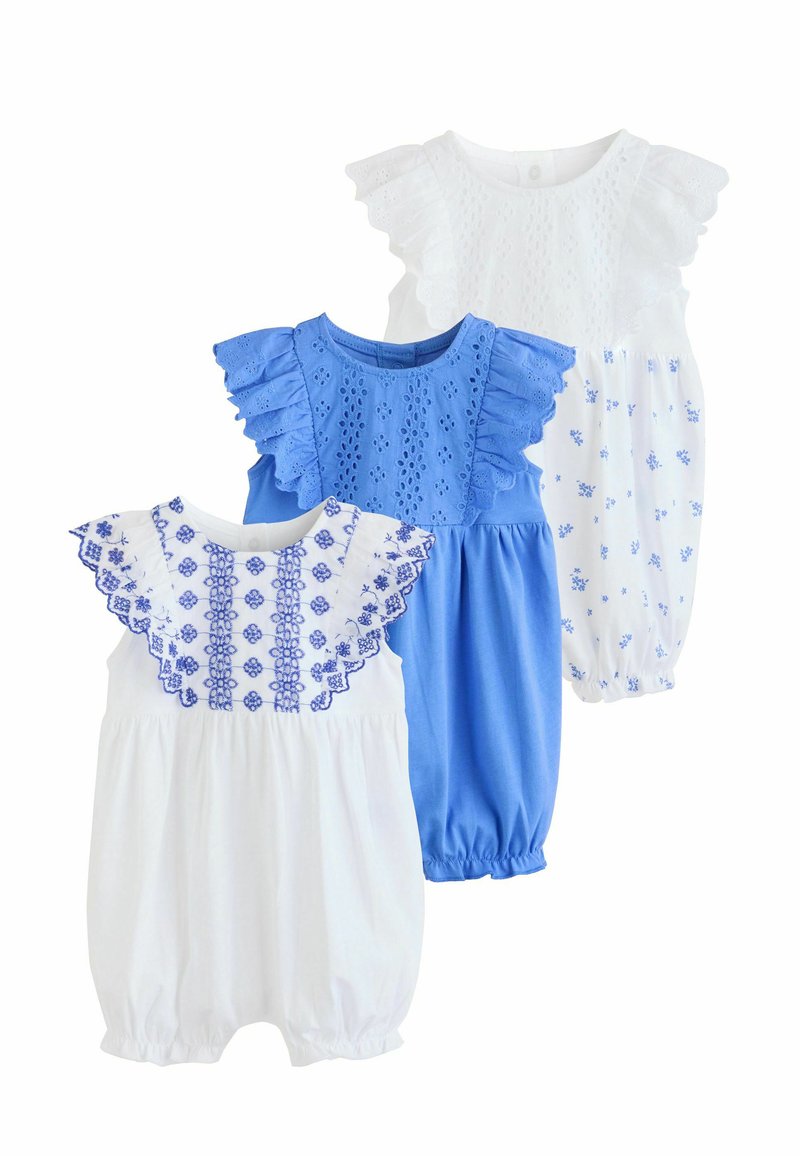 Tre tutine per neonati con dettagli in pizzo ad occhiello e maniche arricciate; una bianca con ricamo blu, una blu unita, una bianca con stampa floreale blu.