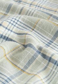 Camicia a maniche lunghe a quadri nei toni di beige chiaro, blu e giallo. Presenta due tasche sul petto e chiusura a bottoni sul davanti. Tessuto morbido.