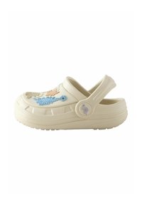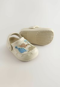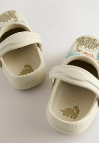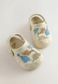 Zoccolo beige con cinturino posteriore e decorazioni colorate in stile pixel testurizzato sulla parte superiore e dettaglio con bottone sul lato.