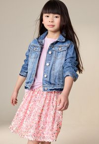 Ragazza giovane che indossa una giacca di jeans, una maglietta rosa, una gonna rosa scintillante, calzini bianchi e sneakers bianche alte, in piedi su uno sfondo neutro.