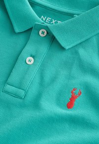 Polo turchese a maniche corte con due bottoni e un piccolo logo rosso a forma di aragosta sul lato sinistro del petto.