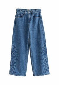 Camicia di denim azzurro chiaro con due tasche sul petto, chiusura a bottoni e vestibilità ampia, abbinata a jeans azzurri chiari a gamba larga e calzature crema.