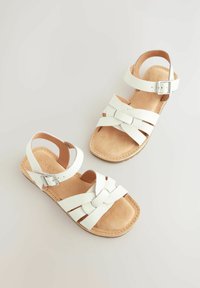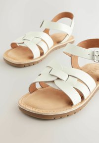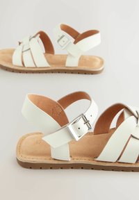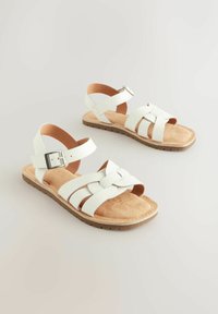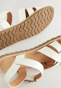 Sandalo bianco con cinturino alla caviglia con fibbia, design con fibbia intrecciata sulla parte anteriore e sottopiede marrone texturizzato. Suola esclusiva in gomma.