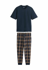 T-shirt in cotone navy con tasca, abbinato a pantaloni da pigiama in flanella a quadri blu. I pantaloni presentano un classico motivo a scacchi e una vestibilità comoda.
