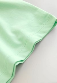 T-shirt verde menta chiaro con collo rotondo, maniche corte e una texture liscia in cotone. Nessun motivo o accento.