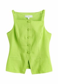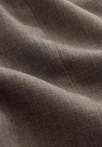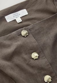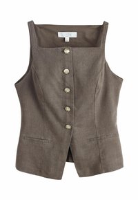 Gilet senza maniche in lino marrone con scollo quadrato, cinque bottoni a forma di conchiglia e due tasche frontali a filetto.