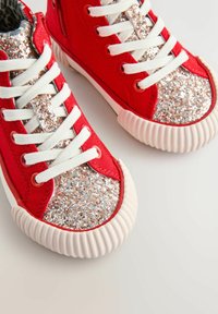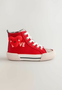 Sneaker alta rossa con punta luccicante, lacci bianchi, applicazione a cuore morbido e suola rigata. Testo "LOVE" sul lato.