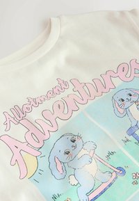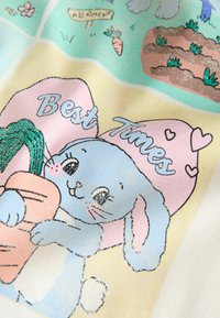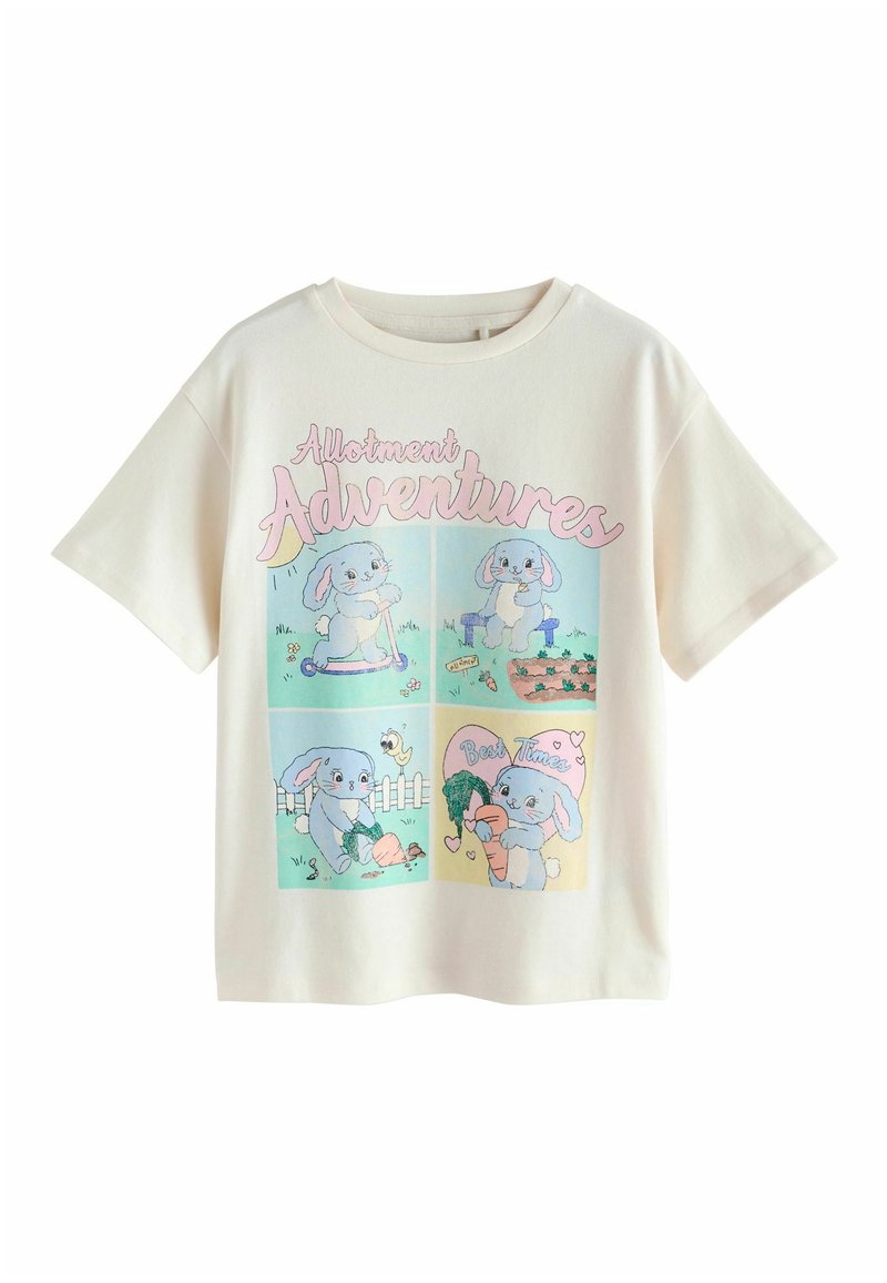 Maglietta crema con coniglietti da cartone animato in tonalità pastello che si cimentano in giardinaggio, vanno sul monopattino e tengono carote, con i titoli "Avventure nell'Orto" e "I Migliori Momenti".