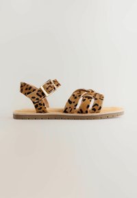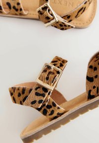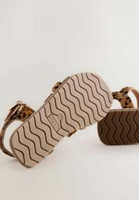 Sandali bassi con stampa leopardata, cinturino alla caviglia regolabile, texture simil-suede e suola marrone chiaro con piccole scanalature per trazione.