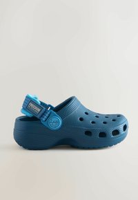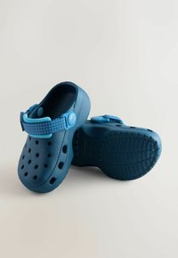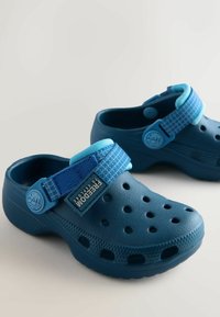 Zoccolo blu realizzato in materiale sintetico leggero, con fori di ventilazione, cinturino posteriore e dettagli testurizzati sulla tomaia.