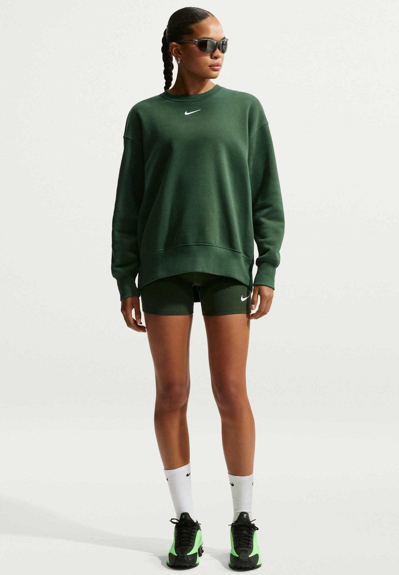 Felpa verde oversize con logo bianco, abbinata a pantaloncini verdi. Completano il look calzini bianchi e scarpe nere con accenti al neon.