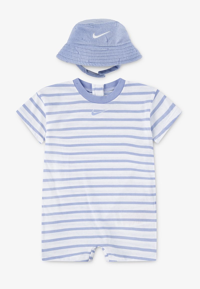 Tutina per neonati a maniche corte a righe azzurro chiaro e bianco con cappello a secchiello coordinato in spugna, entrambi con logo Nike bianco.