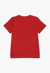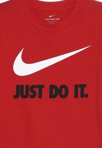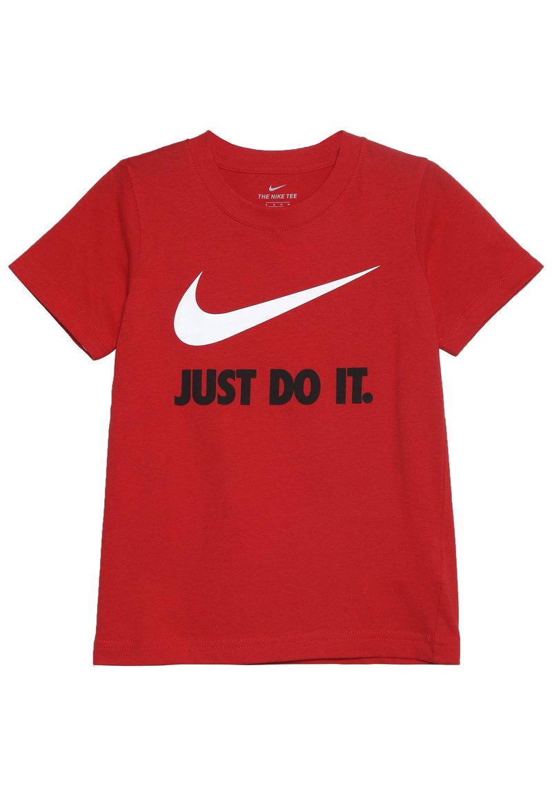 Maglietta rossa in cotone con maniche corte, presenta un grande swoosh bianco Nike e la scritta nera "JUST DO IT." sul davanti.
